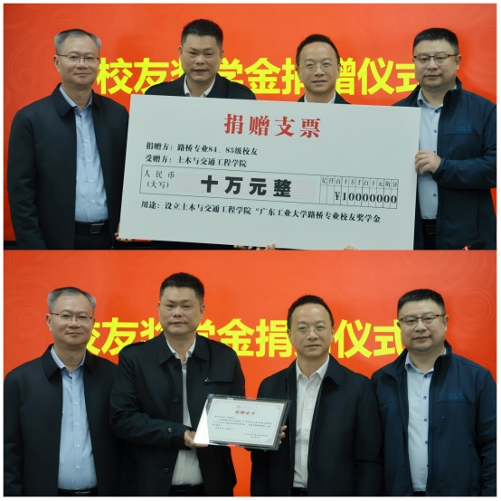 “广东工业大学路桥专业校友奖学金”为路桥专业84、85级校友为感恩母校栽培、支持学院教育事业发展而设立。奖学金共捐赠人民币100000元,旨在奖励学院路桥专业的优秀本科生及路桥专业方向的优秀硕士研究生。捐赠仪式上,周建强、赵志伟接受校友捐赠并为路桥专业84级、85级校友代表李春辉、钟裕国颁发捐赠证书。