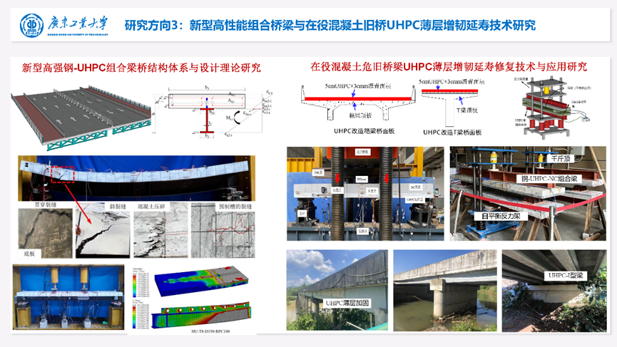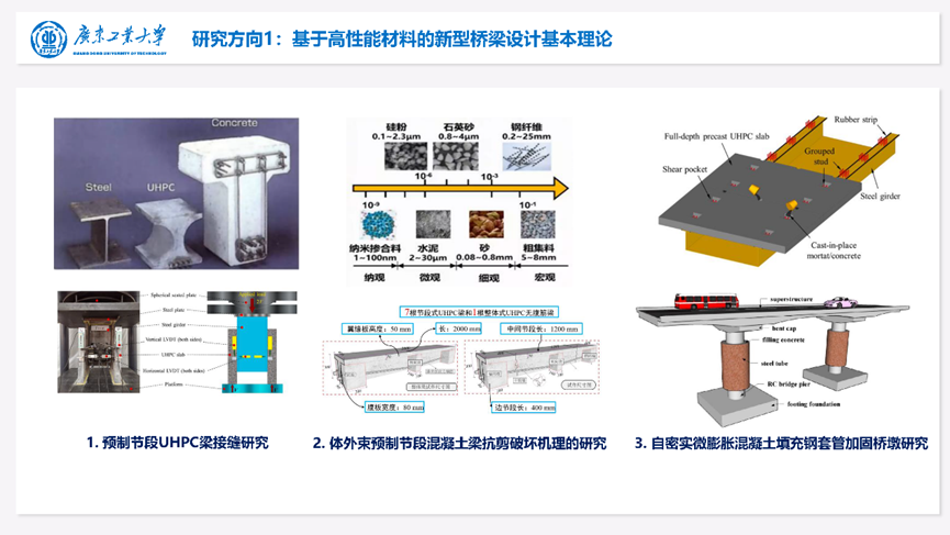 重点研究方向:本学科面向国家重大需求,瞄准交通强国、一带一路等国家战略,围绕《交通强国建设广东试点实施方案》,聚焦重大科技问题,形成了(1)基于高性能材料的新型桥梁设计基本理论、(2)桥梁结构加固与改造技术、(3)新型高性能组合桥梁与在役混凝土旧桥UHPC薄层增韧延寿技术研究等3个特色鲜明、优势突出的研究方向。