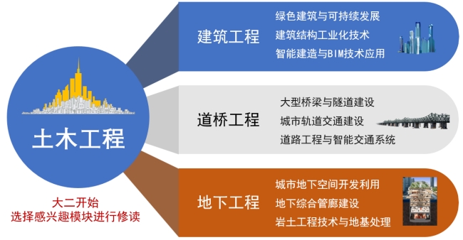 通用模块:土木工程制图基础、理论力学、材料力学、结构力学、工程地质、土力学、流体力学、工程结构荷载与可靠度设计原理、基础工程