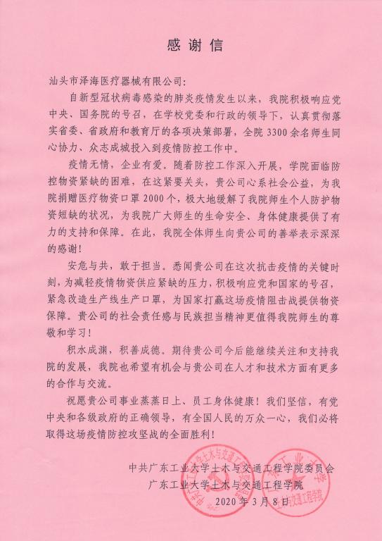 据悉,汕头市泽海医疗器械有限公司在这次抗击疫情的关键时刻,为减轻疫情物资供应紧缺的压力,积极响应党和国家的号召,紧急改造生产线生产口罩,为国家打赢这场疫情阻击战提供物资保障。在此,我院全体师生向汕头市泽海医疗器械有限公司的善举表示深深的感谢!我们坚信,有党中央和各级政府的正确领导,有全国人民的万众一心,我们必将取得这场疫情防控攻坚战的全面胜利!