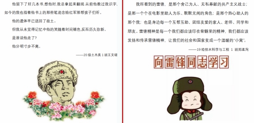 3月11日至3月20日,学院团委开展了以“词传我意颂雷锋”为主题的征文活动。征文小组共征集了土木学子撰写的20多篇与雷锋精神相关的文章,并从中挑选出三篇优秀且对雷锋精神有深刻体会和理解的文稿进行了表彰。此次活动以文字的形式展现了同学们对于雷锋精神的理解和体会,加深了雷锋精神在土木学子心中的印象。