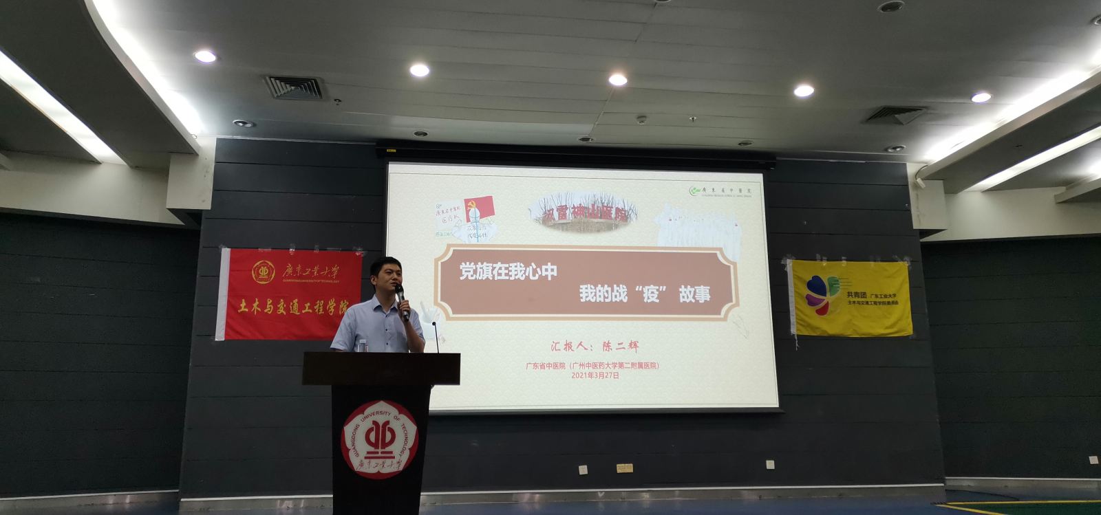 3月27日下午,第二场分享会在大讲堂圆弧报告厅举办。主讲嘉宾为广东五四青年奖章获得者、广东省中医院血液科护士长兼武汉雷神山医院感染三科六区护士长陈二辉。在观看完人民日报社制作的短片《听我说谢谢你》后,陈二辉护士长登台为我们作了题为《党旗在我心中 我的战“疫”故事》的报告,他讲述逆行而上、援助武汉的战“疫”故事,他用生动的语言再现了“白衣战士”生死救援的艰难时刻,细细道来与患者之间真挚的感情。在抗疫斗争中,他与千千万万个平凡人挺身而出,慷慨前行。一张张图片和一个个故事凝聚成为伟大的抗疫精神,给同学们带来了情感的共鸣和心灵的触动。他回忆了在抗击疫情中经历的艰难时刻与感人瞬间,讲述了使命、责任、坚守和感动的种种事迹,字字句句感人肺腑,动人心弦,使在场听众深受鼓舞,多次报以热烈的掌声。